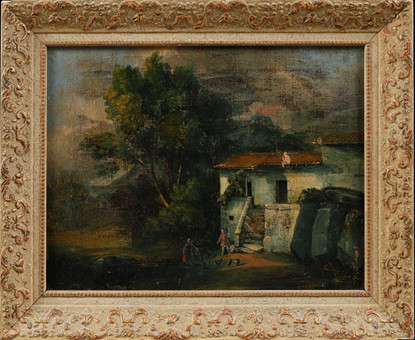 OIDENTIFIERAD KONSTNÄR. Gårdsmiljö med figurer, olja på duk.