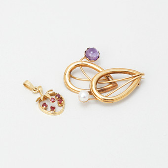 HÄNGE och BROSCH, 18k guld, rubiner, ametist, pärla, totalvikt ca 4,9 gram.