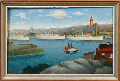 OSCAR SVENSSON. Vy mot Göteborg med båtar från S.A.L, olja på pannå, signerad.