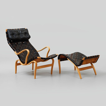 BRUNO MATHSSON. Fåtölj med fotpall, "Pernilla", Firma Karl Mathsson, 1970-tal.